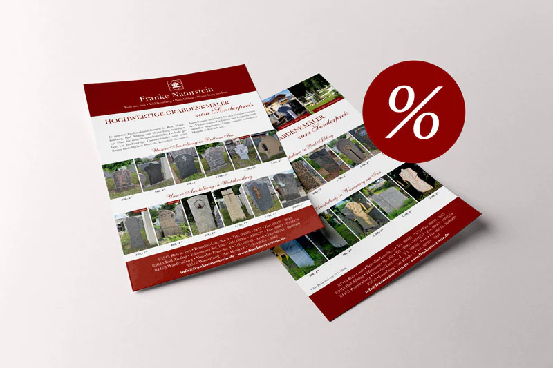 Besuchen Sie unsere Ausstellungen, lassen Sie sich überraschen von der Vielfalt unserer Grabsteine und fragen Sie nach aktuellen Angeboten. In unserem Flyer finden Sie einige unserer reduzierten Modelle.