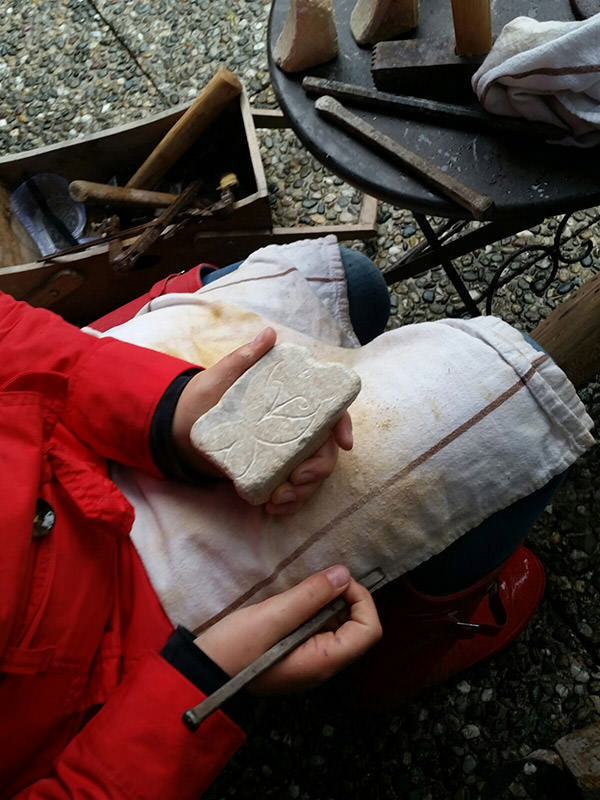 Steinmetzen für Kinder mit Speckstein. Beschriftungen mit Kreide auf Schiefertafeln.